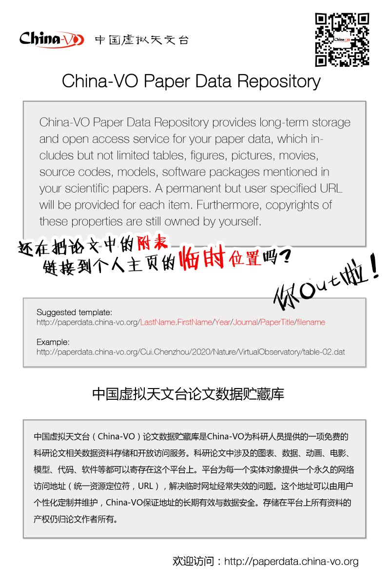 应天文学家的要求,中国虚拟天文台设计开发的论文数据贮藏库(China-VO Paper Data Repository)今日正式上线。China-VO论文数据贮藏库是一项免费的科研论文相关数据资料存储和开放访问服务。科研论文中涉及的图表、数据、动画、电影、模型、代码、软件等都可以寄存在这个平台上。平台为每一个实体对象提供一个永久的网络访问地址(统一资源定位符,URL),解决临时网址经常失效的问题。这个URL地址可以由用户个性化定制并维护,China-VO保证地址的长期有效与数据安全。存储在平台上所有资料的产权仍归论文作者所有。