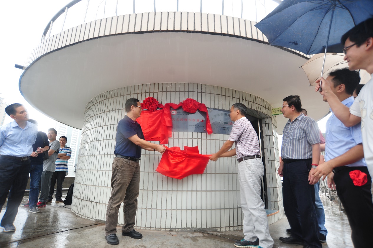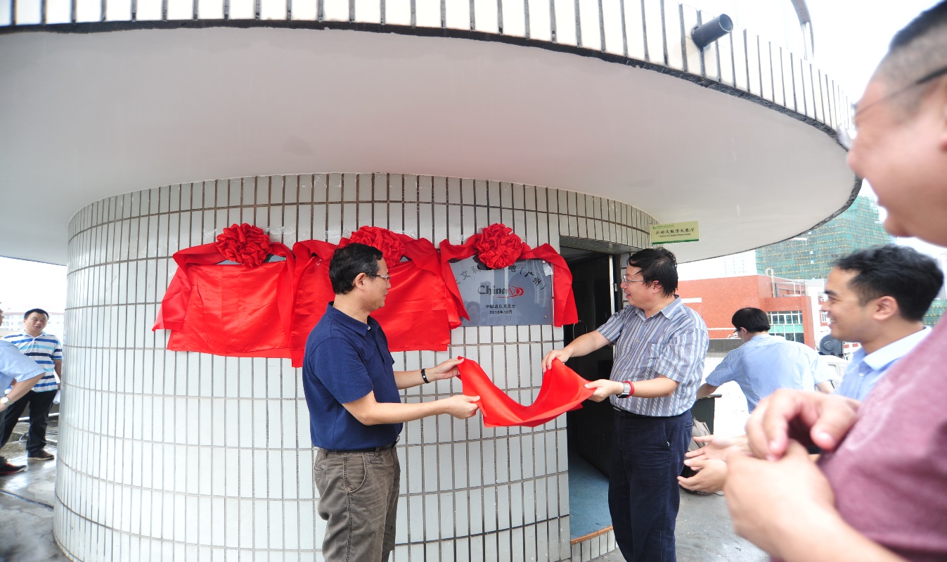 图4 广州大学物理与电子工程学院邓荣标老师与华南师大附中吴青副校长共同为天文教育实践基地揭牌