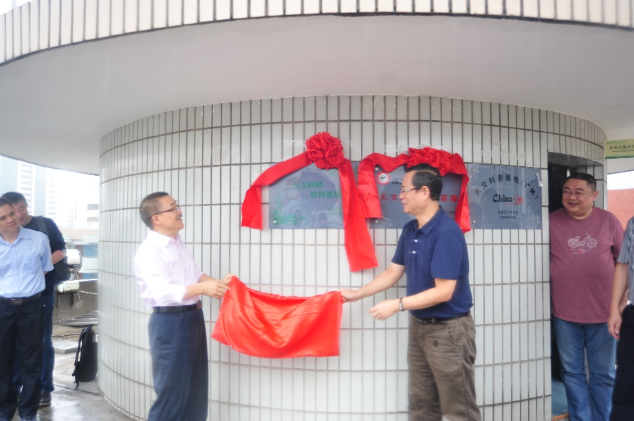 图5 广东天文学会副理事长彭青玉教授与华南师大附中吴青副校长共同为天文科普教育基地揭牌