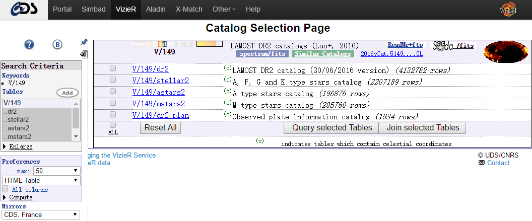 图2 LAMOST DR2数据在VizieR系统中的访问界面