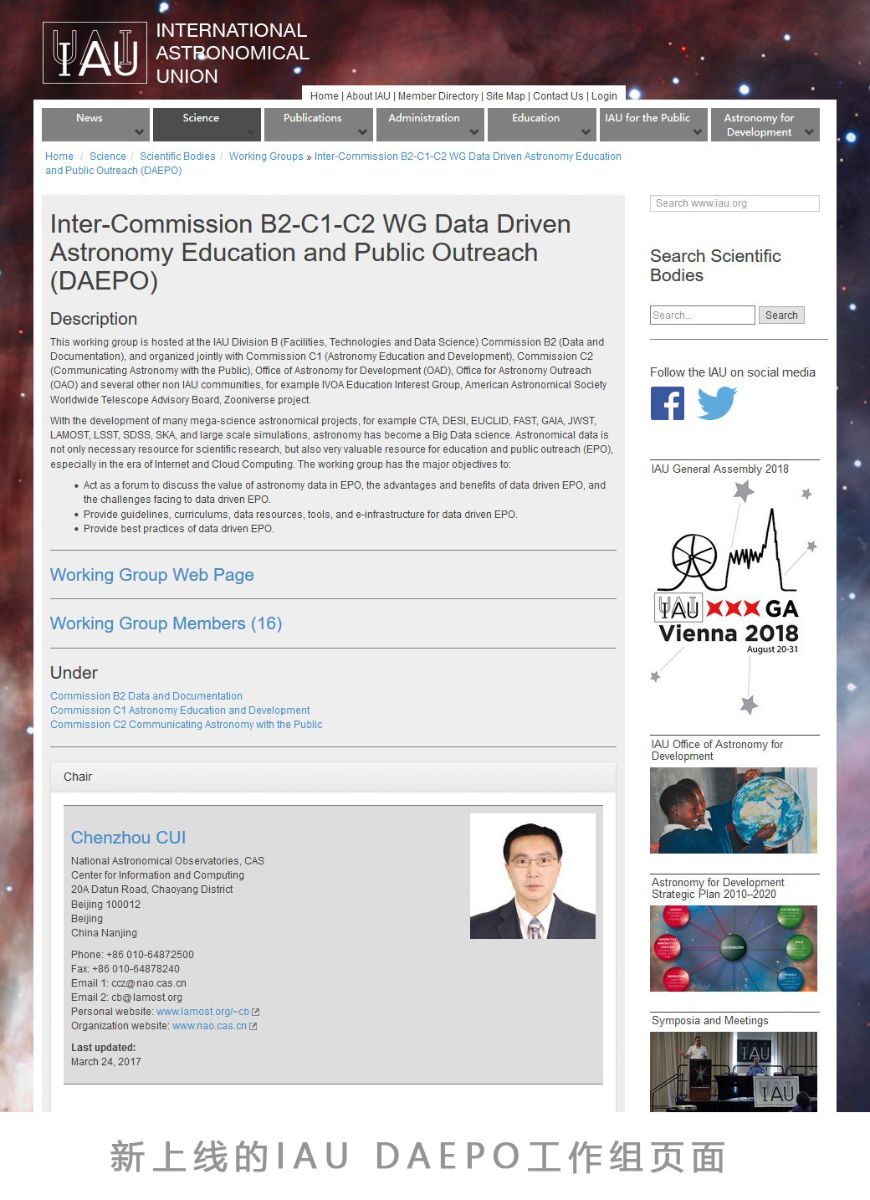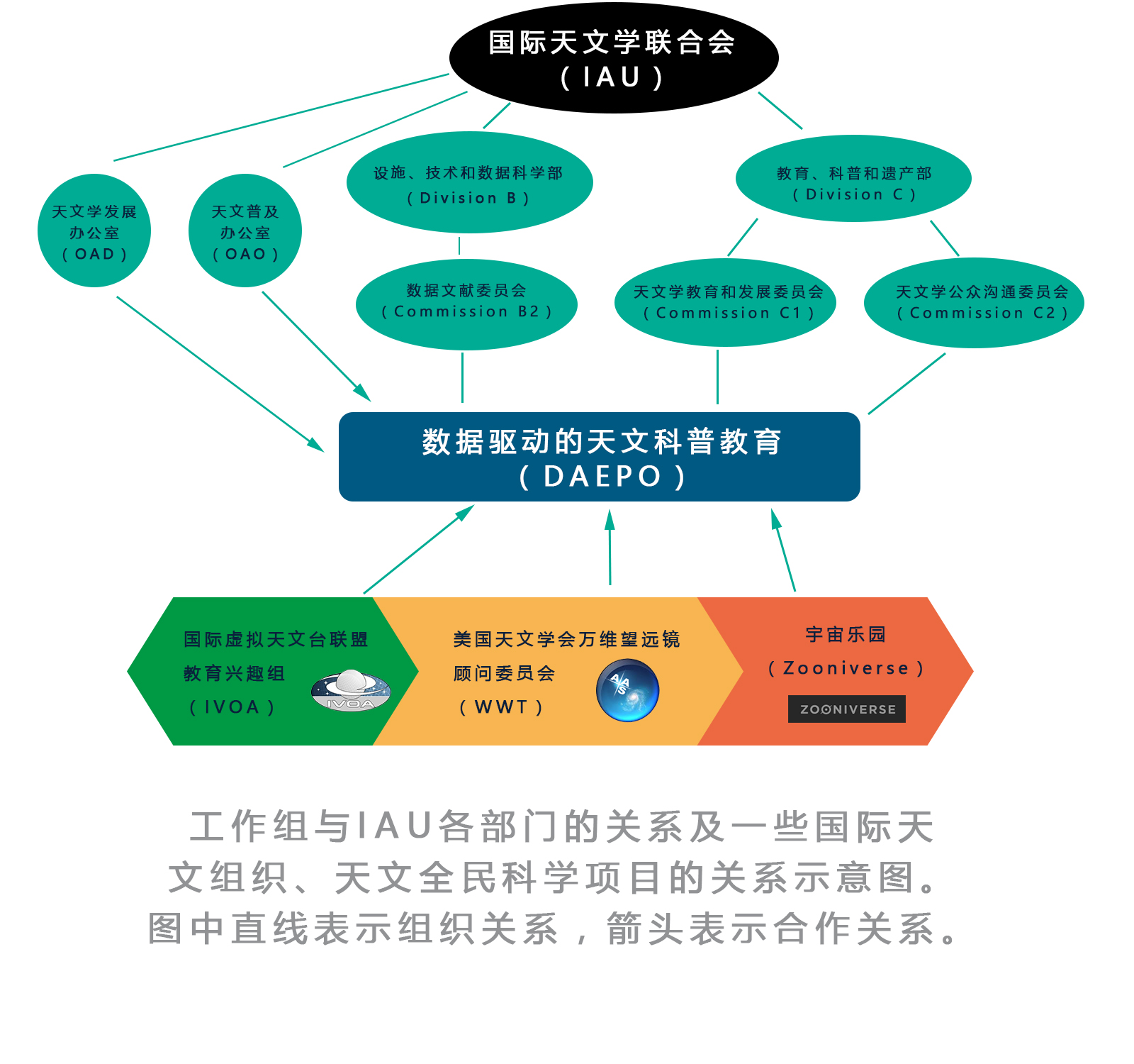 近日,国际天文学联合会(简称IAU)跨委员会联合工作组“数据驱动的天文学科普教育”工作组完成组建并通过IAU的审核。这个工作组挂靠在IAU“设施、技术和数据科学部(Division B)”的“数据文献委员会(Commission B2)”,由IAU的“天文学教育和发展委员会(Commission C1)”、“天文学公众沟通委员会(Commission C2)”、“天文学发展办公室(OAD)”、“天文普及办公室(OAO)” 等共同组织,同时与国际虚拟天文台联盟教育兴趣组、美国天文学会万维望远镜顾问委员会、宇宙乐园(Zooniverse)项目等非IAU组织保持密切合作。