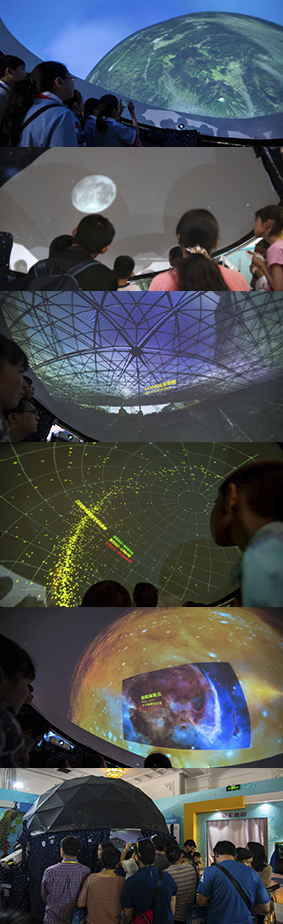 基于万维望远镜平台,集合了全世界真实天文数据,并以球幕化的方式进行展示的互动式数字天象厅能够带给人最直接的震撼。所有现场展示的影片内容,从嫦娥三号登月拍摄月面全景图,到五百米口径射电望远镜(FAST)建设现场,再到通过哈勃空间望远镜、斯隆数字巡天数据展示星空的瑰丽和美妙,甚至是以数据可视化方式带领人们领略地球地理奇观,……其中所用到的画面和数据,都来自实际拍摄和天文观测,并非模拟形成。这种基于真实数据的教育科普方式,也是中国虚拟天文台所特有并一直坚持的。