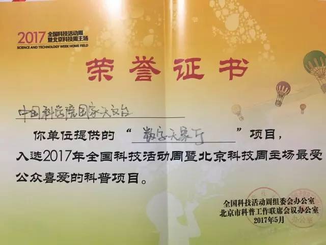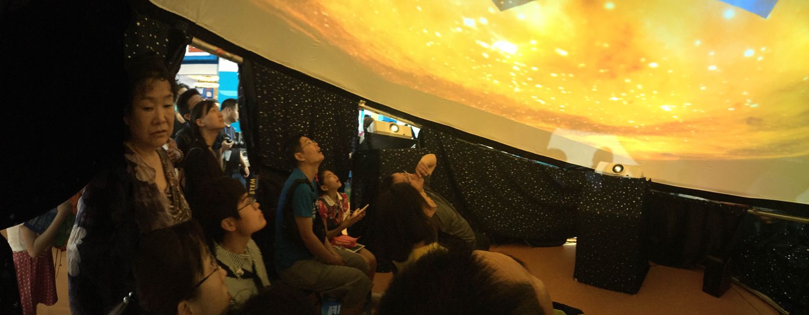 5月20日至27日,2017年全国科技活动周暨北京科技周活动在民族文化宫火热开展。由国家天文台、梧台科技发展有限公司、华中师范大学、北京工业大学、北京天文馆等共同开发的“互动式数字天象厅”继去年亮相科技周并大受欢迎之后,再次以全新的设计登场。在充分挖掘了互动式数字天象厅的潜力后,展现了真实天文观测数据可视化后的魅力,将天文知识和中国天文学研究发展的前沿消息传递给所有观众。数字天象厅项目也再度被评为最受公众喜爱的科普项目,又一次获得了公众的认可。