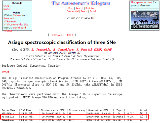 10月19日,帕多瓦-阿齐亚戈超新星项目组(Padova-Asiago Supernova Group)使用1.82米口径望远镜对该目标进行光谱证认,确认为一颗 Ia-91bg 型超新星。该超新星获得正式编号 SN 2017hle。