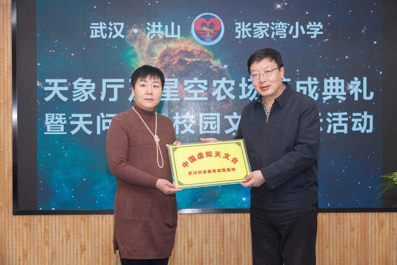 郝晋新副台长和湖北省科技馆馆长王汉祥共同为张家湾小学“万维天象厅”揭牌。嘉宾们在天象厅中欣赏了震撼的漫游节目。随后,在学校领导的陪同下,活动嘉宾参观了学校星空农场,考察了学校天问校园文化的建设情况。