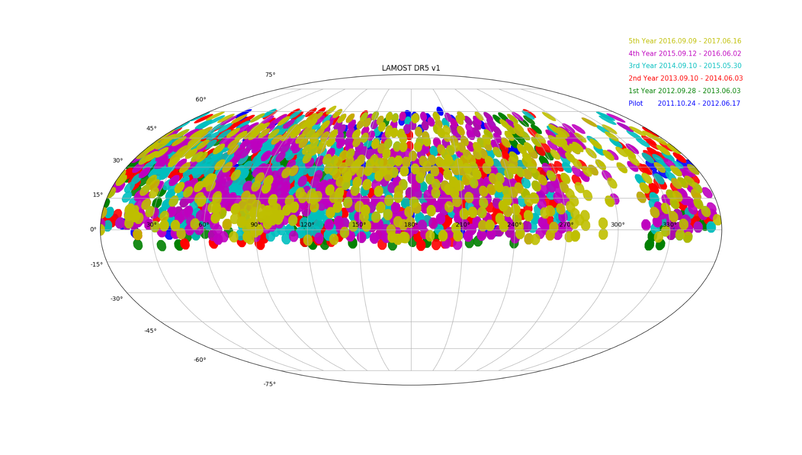 LAMOST DR5的天区覆盖图,不同颜色代表不同观测年度