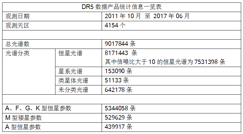 LAMOST DR5包括先导巡天及一期五年正式巡天4154个观测天区中逾9百万条光谱,其中高质量光谱数(S/N>10)超过750万条。另外,发布数据中还包括了5百万颗A、F、G、K型恒星参数表,50万颗M型矮星参数表等。LAMOST再一次以“实际行动”证明了其光谱获取率世界第一的能力。