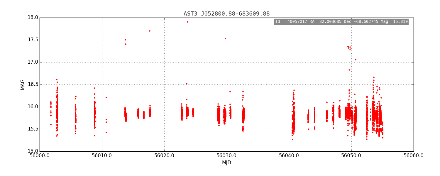 中国虚拟天文台(China-VO)为AST3提供了原始数据的归档、备份以及产品数据的归档、备份和整理发布。本次发布的数据包含三个部分:图像数据(AST3-1 Image)、光变曲线数据(AST3-1 Light Curve)以及巡天数据(AST3-1 Survey)。其中:图像数据14460个、光变曲线数据1972054条,巡天数据16165061条。在此基础上,中国虚拟天文台还对光变曲线的数据采集点数进行了统计,同时为每条光变曲线数据进行可视化并生成图像,让天文学家可以更直观的观察数据,为天文学家提供更加有效的科研支持。