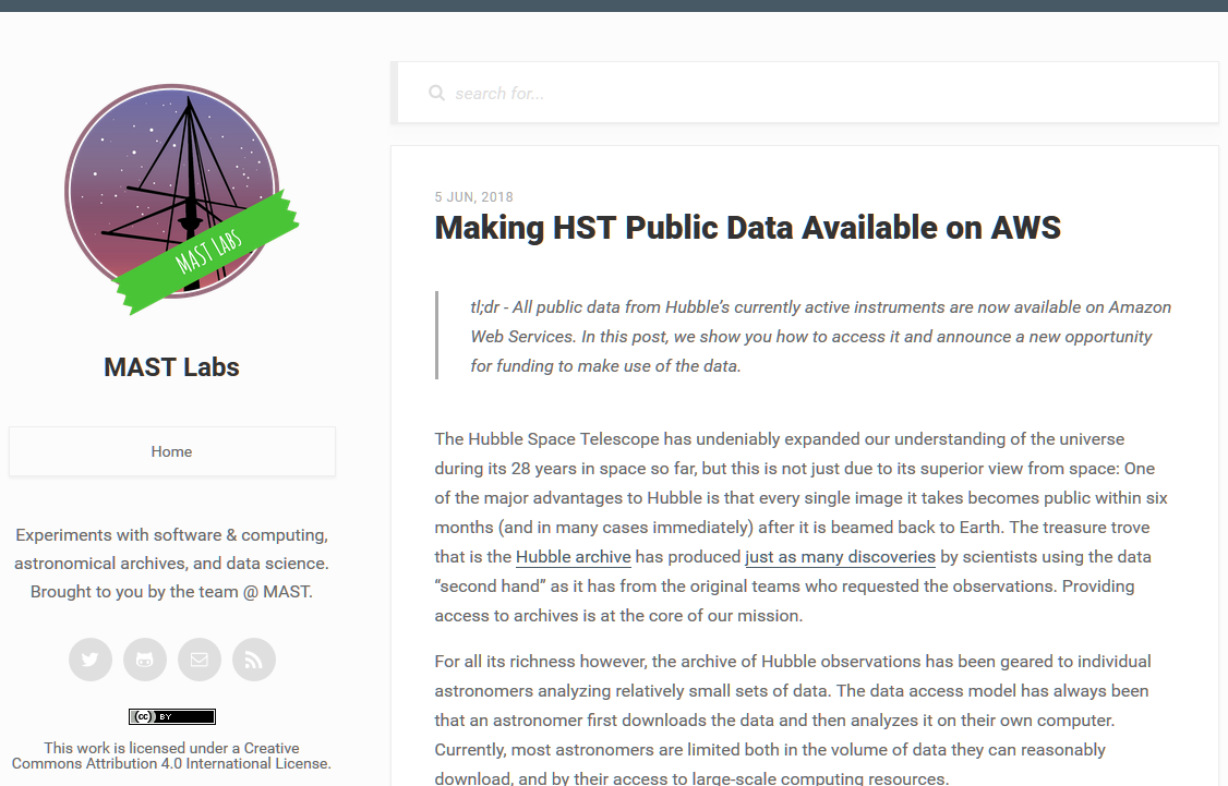 据STScI数据中心 MAST Labs 网站报道,哈勃空间望远镜(Hubble Space Telescope, HST)将大约110TB的图像及光谱数据上传至亚马逊云服务(AWS)。