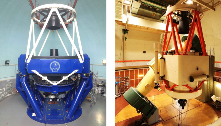丽江天文观测站2.4米望远镜(左)目前是东亚口径最大的通用型光学望远镜,其光学像质、成像分辨率、指向和跟踪系统等处于国内较好水平;兴隆观测基地2.16米望远镜(右)是我国自行研制的两米级光学望远镜,配备了现代化的焦面仪器,被誉为中国天文学发展史上的一个里程碑。