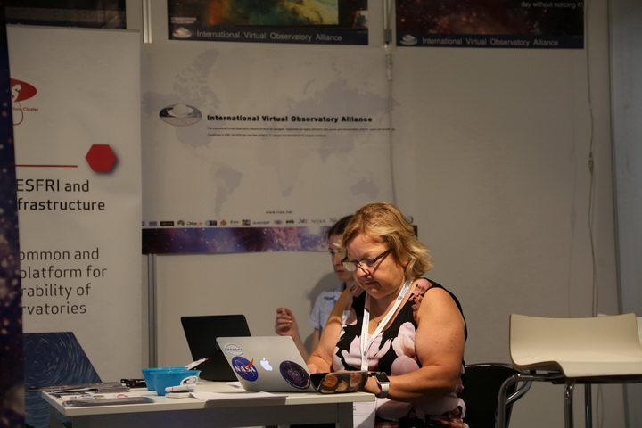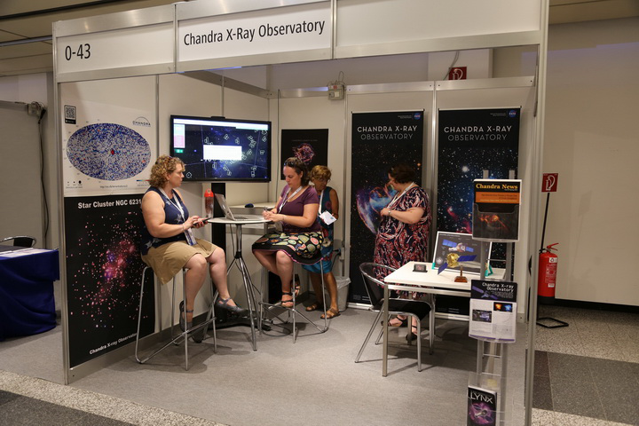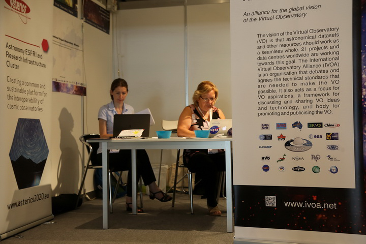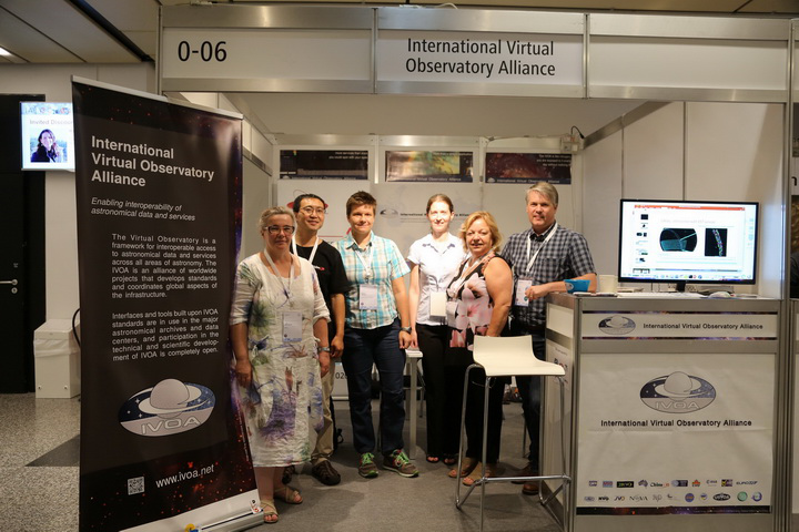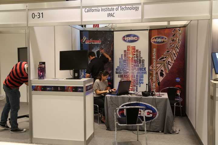 IVOA的展台设在主展区通往海报区的咽喉要道处。IVOA最新版的LOGO全家福、展台背景海报、展桌装饰海报的设计均出自China-VO的小才女@珊珊之手。