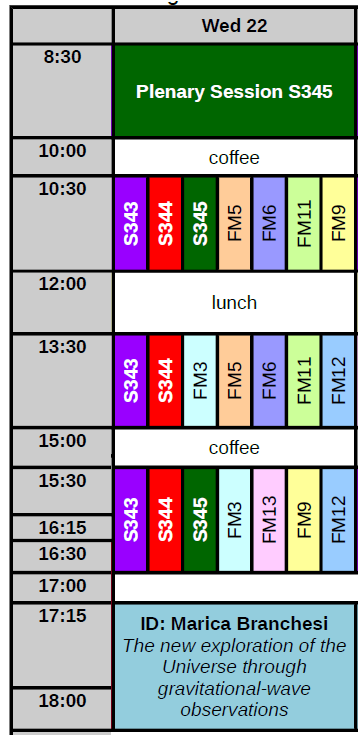 22日,S343(渐近支巨星与星系)、S344(矮星系)、S345(生命起源)、FM5(历史记录中的时变现象)、FM6(星系角动量)、FM11(韦布空间望远镜)和FM13(国际天文学活动的全球协调)仍将持续进行。新开的3个专题研讨会包括FM3(射电星系)、FM9(太阳辐照度)、FM12(天文学标定与标准化问题)。下午有一场关于引力波观测的特邀报告。