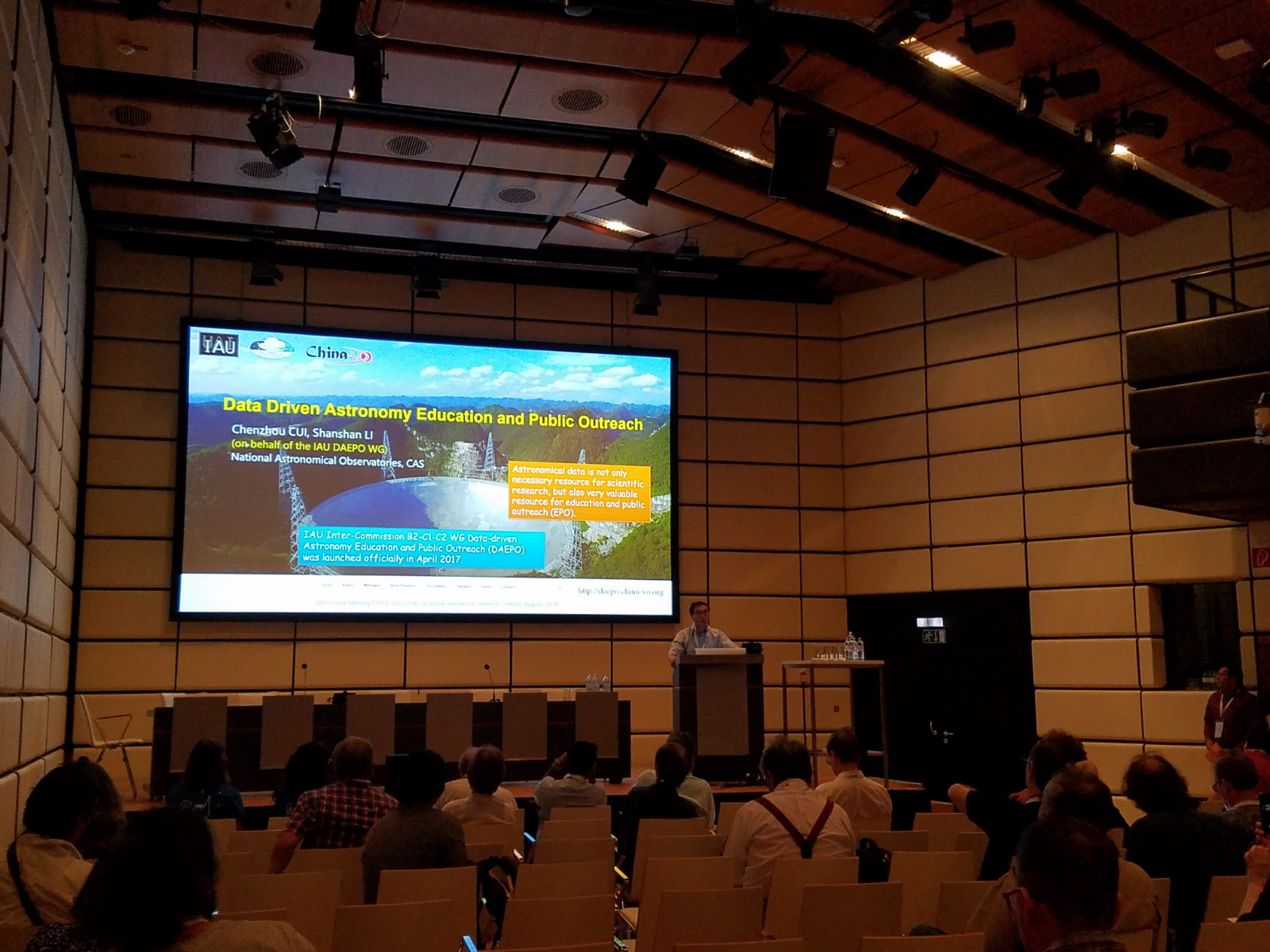 来自意大利虚拟天文台计划的Giulia Iafrate为研讨会开篇,做了题为“虚拟天文台的教育应用”的报告。我以“数据驱动的天文科普教育(DAEPO)”为题分享了DAEPO的理念和IAU DAEPO工作组的进展。DAEPO工作组成员、国际天文馆协会主席Mark SubbaRao在他的报告“全球科学中心和天文馆的高效联动”中强调“DATA2DOME”是未来天文馆发展的一个重要方向。北京天文馆馆长朱进博士作为中国的国家联系人参加了“IAU国家科普联系人网络”圆桌论坛。