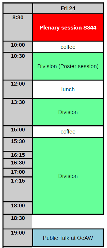 24日是本届大会第一个学部科学日,仅在早上安排了一小节S344(矮星系)分会的学术报告。从上届夏威夷大会开始,IAU在大会期间专门设置了学部科学日(Division Days),安排在第1周的周五和第2周的周一。这两天原则上没有任何其他平行的学术会议,也不再是以前的纯事务性会议,向所有参会者开放。这是IAU北京大会上决定的一项改革措施。