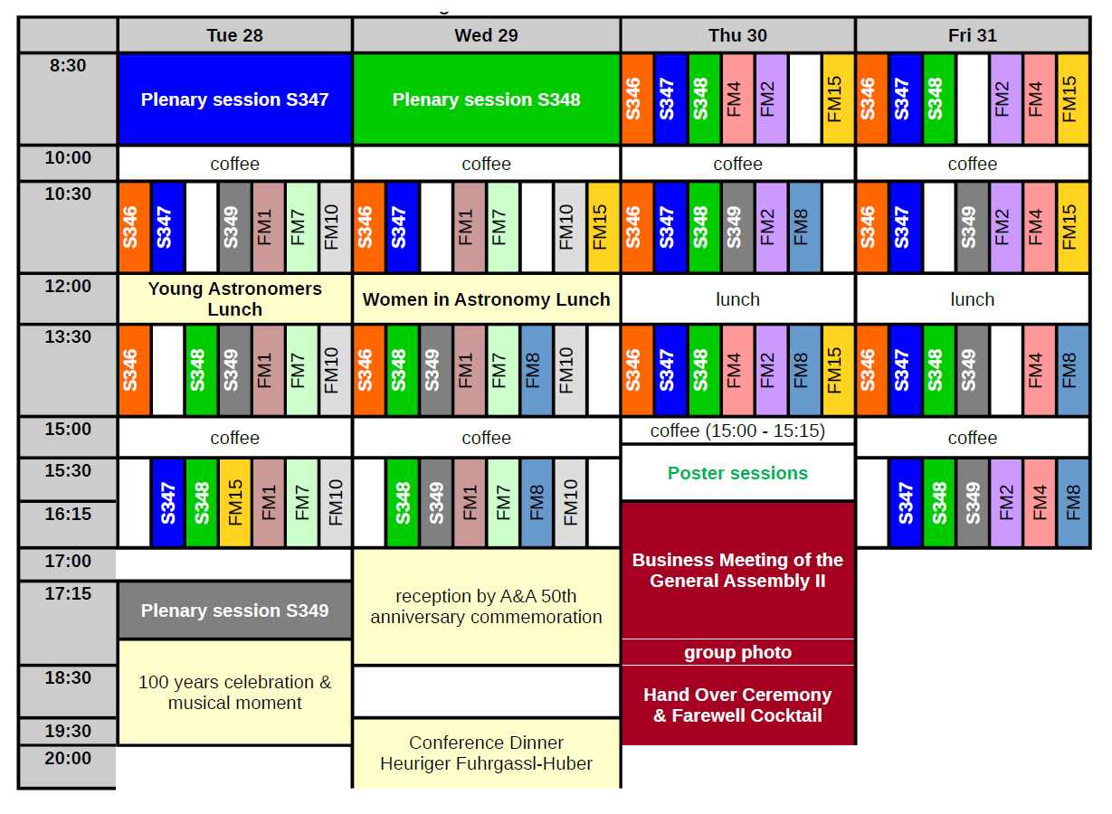 大会后半段还有很多精彩的内容。S346(高质量X射线双星)、S347(甚大望远镜早期科学)、S348(新世纪的天体测量学)、S349(IAU百年论坛)、FM1(小行星家族百年)、FM2(宇宙中的重子物质)、FM4(磁场与恒星形成)、FM7(星系中的金属丰度梯度)、FM8(宇宙磁场)、FM10(宇宙中的纳米粉尘)、FM15(天文学与社会发展),共11场学术研讨会将轮番登场。