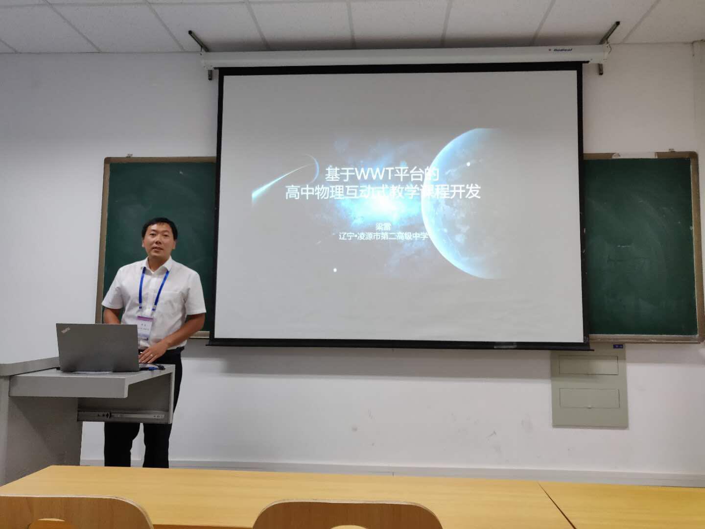 同时,梁雷老师也受邀在教学分会场做了题为《基于WWT平台的高中物理互动式教学课程开发》的报告。在报告中,梁老师对万维望远镜的发展历程进行了介绍,并对其在教学科普中的广泛应用做了详尽的讲解及演示。