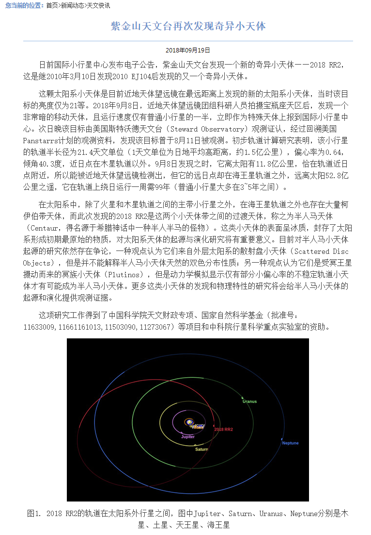 2018年9月19日,在紫金山天文台网站上发布了一则名为《紫金山天文台再次发现奇异小天体》的快讯,其内容展现了奇异小天体2018 RR2的发现经过、物理特性以及它在太阳系演化中的意义。