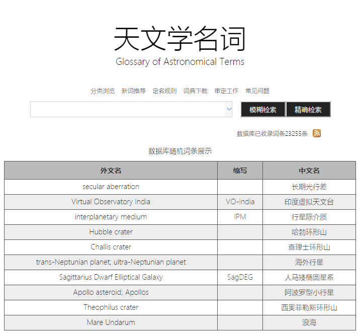 自2002年崔辰州基于《英汉天文学名词》(李许本)WPS电子版在其个人主页上实现了一个简单的“天文词典”,中国虚拟天文台逐步建立中国天文学名词数据库,并实现名词中英文在线查询、新词提交、分类查询等功能。十几年来中国虚拟天文台不但持续推进天文学名词网络化、信息化的进程,还帮助实现天文学名词委名词审定工作信息化,极大程度促进了天文学名词的推广和使用。