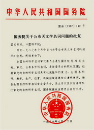 1987年8月12日,国务院签发“国务院关于公布天文学名词问题的批复”,天文学名词成为全国自然科学名词审定委员会的第一项成果。