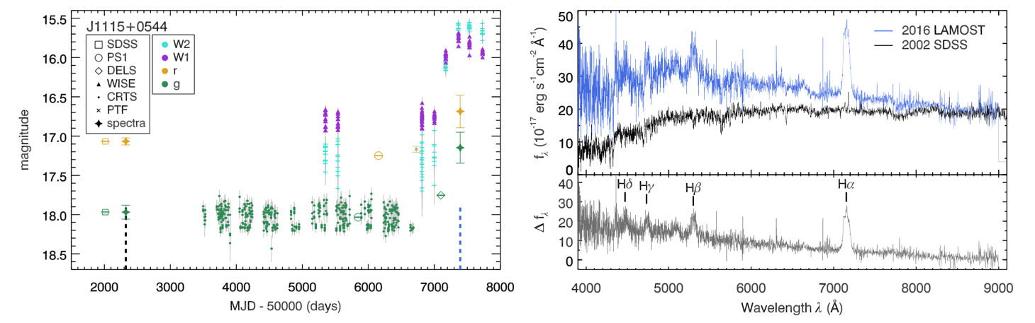 左图:一个新发现的变脸类星体J1115+0544的光学和中红外波段光变曲线,相同颜色代表同一波段的光变。