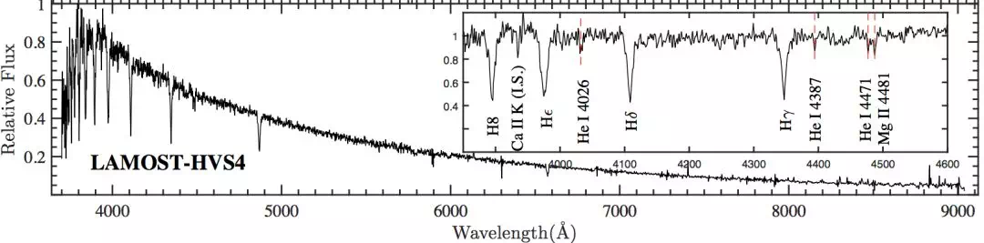 图1: 新发现的超高速星LAMOST-HVS4的光谱图。局部放大的子图中展示了B型星光谱中的HeI和MgII线。