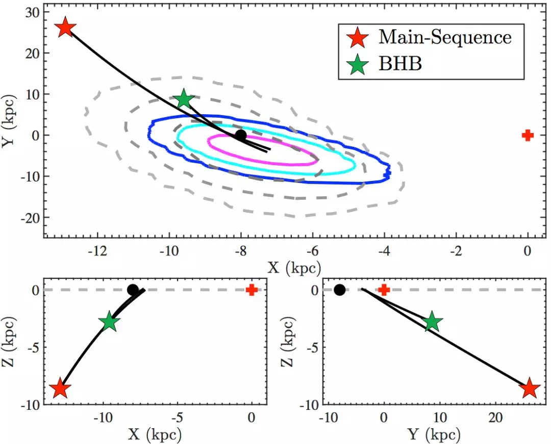 图3: 新发现的超高速星LAMOST-HVS4的轨道及在银盘上可能的诞生区域。三幅图中红色和绿色五角星分别代表它为主序星和BHB星时的位置;黑色的曲线代表它的轨道;黑色实心原点代表太阳的位置,红色十字代表银心的位置;上面图中三个彩色实线分别代表它为主序星时在1σ、2σ和3σ置信度下在银盘上可能的诞生区域,灰色的虚线分别代表它为BHB星时不同置信度下在银盘上的诞生区域。