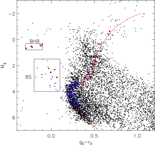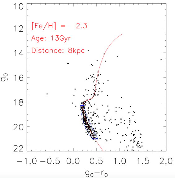 图1右图:GD-1的成员星。红线是金属丰度为-2.3(约为太阳丰度的1/200),年龄130亿年和距离8kpc(约2.6万光年)的等龄线。左图:黑色点是处在GD-1轨道上的星,红色和蓝色圆分别是具有LAMOST DR6和SDSS DR14光谱的星。中间红线是年龄130亿年,金属丰度为-2.3的等年龄线。BHB星和BS星的位置用方框表示。