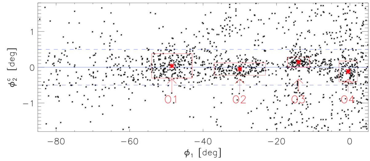 图2 GD-1星流成员星沿着星流轨迹的分布。分别用O1,O2,O3和O4标记4个恒星密度高的区域。