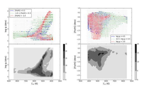 利用大样本统计方法,能够提取出对应参数空间内光谱的典型特征,与单次源观测的光谱相比, 统计的典型光谱质量更高,参数标记更可靠。利用LAMOST DR5 已确定的534万组恒星参数,通过大样本统计分析,杜冰等人最终构建了2892条高质量的恒星模板光谱。 其参数覆盖范围较广,有效温度从 3750K 到 8500 K,金属丰度从 -2.5 dex 到 1.0 dex, 表面重力加速度从 0 dex到 5.0 dex (见图1)。 利用LAMOST 观测的大量恒星,构建了更密集的 K 型模板, 从而弥补了目前实测光谱库缺乏 K 型的不足。