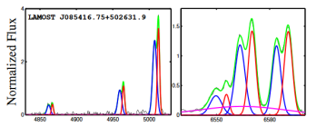 窄线双峰发射线星系在研究活动星系核窄线区动力学以及星系并合的过程中具有重要作用,尽管目前的空间分辨率已经能够分辨个别活动星系核的窄线区,但是人们对于窄线区的理解仍然有限。截止目前,LAMOST已发布约20万条河外光谱数据,这为系统地搜寻窄线双峰源及后续研究星系并合及窄线区动力学提供了宝贵的数据支持。河外光谱呈现出的发射线窄线双峰轮廓的起源一般认为来自于三种机制,分别为外流现象、星系并合相关的双核绕转活动以及带有扰动或被尘埃遮掩的旋转盘状结构。