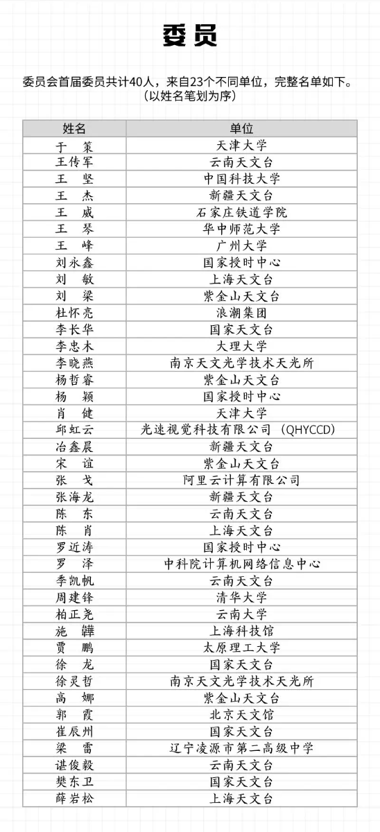 经过中国天文学会十四届理事会第一次会议、常务理事会第一次会议批准和委员会内部严格筛选,中国天文学会信息化工作委员会(简称信息委)首届委员完整名单出炉。