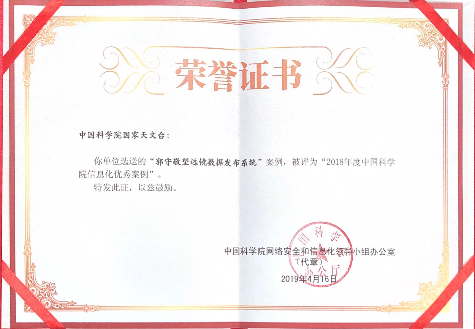 近日,郭守敬望远镜(LAMOST)数据发布系统被评为“2018年度中国科学院信息化优秀案例”。