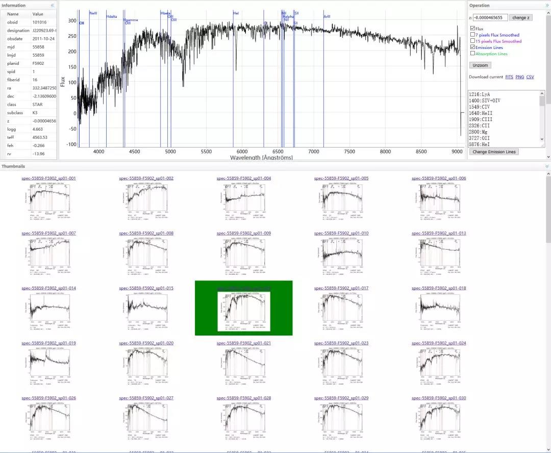 为了方便天文学家和其他用户快速查看某个目标的光谱,发布系统提供了基于HTML5的在线光谱查看功能。通过检索系统找到特定的目标之后,就可以直接在浏览器中对光谱进行显示和分析。即使在手机上也可以很方便地查看光谱曲线和数据。除查看缩略图外,用户还可以放大、缩小光谱曲线,查看光谱基本信息及分类、修改红移值、自定义光谱发射线及吸收线,寻找自己需要的光谱特征。