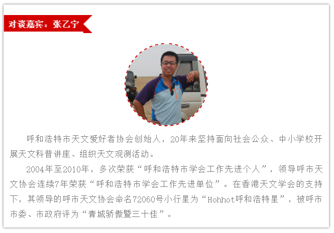 张乙宁:近几年研学旅行越来越热,全国各地的青少年都来到了内蒙的草原和沙漠开展观星等活动。我本身是呼市旅游行政主管部门的工作人员,同时又是一名天文爱好者,所以希望能通过自己的努力,将普通的观星活动转化为天文主题的研学课程,同时结合当地现有的科普教育资源真正让孩子们学有所得。