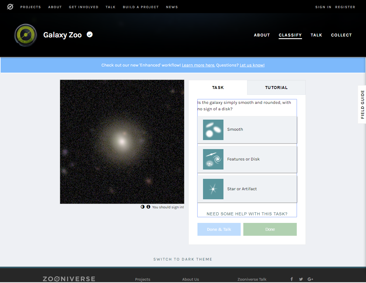 星系动物园项目将专业望远镜观测获得的星系图片切分好后放到网上,供爱好者和社会公众浏览并判断图片上的星系类型。是旋涡星系?还是棒旋星系?又或者是椭圆星系?不规则星系?用户判断的结果经项目组审核并收集,再交由专业天文学家使用进行科学研究。该项目于2007年上线,已经运行超过十年,超过百万人参与,在全世界有着较大的影响力,并产生了包括哈尼天体在内的多项科研成果。