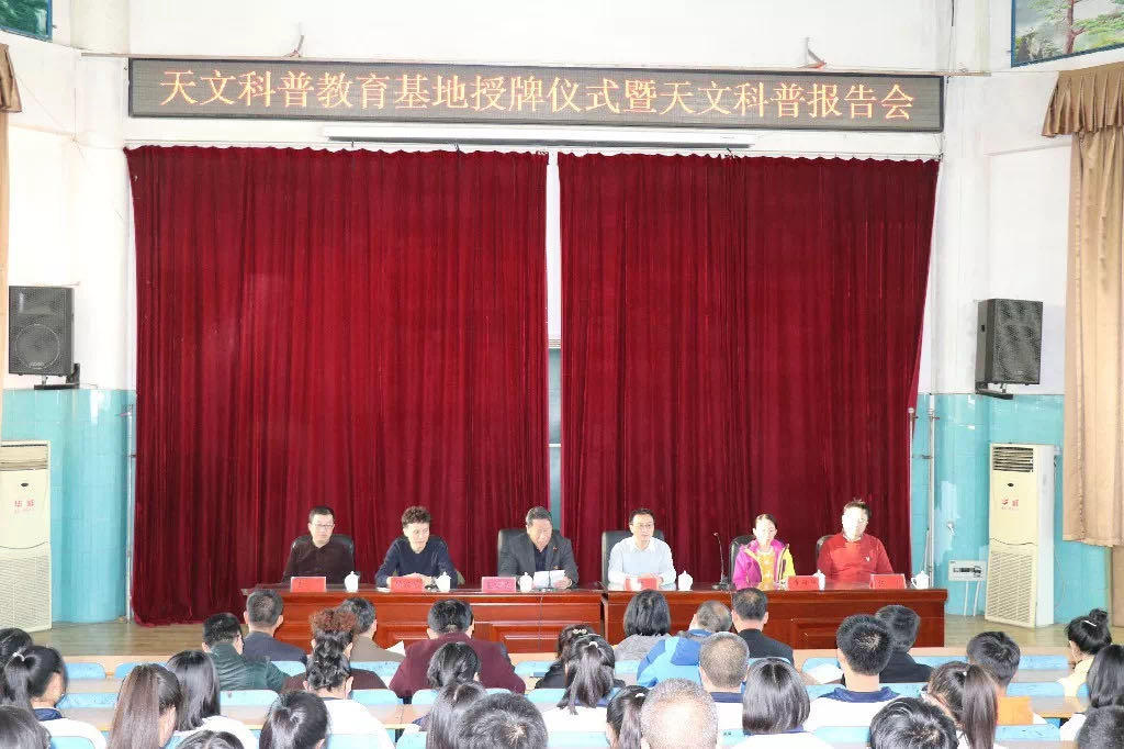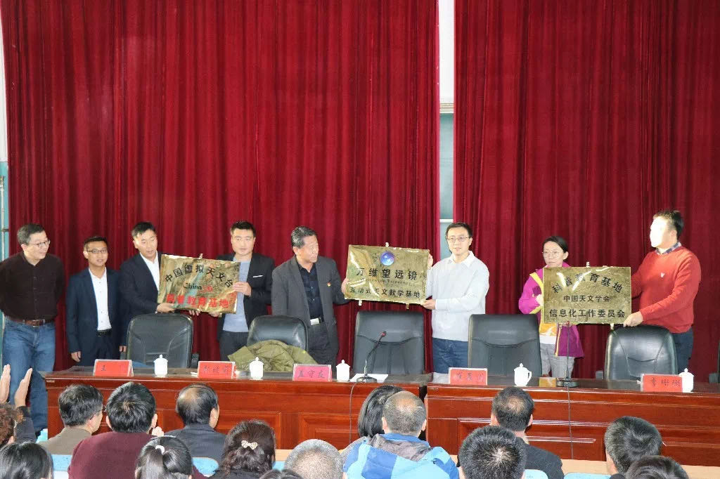 中国科学院国家天文台研究员、虚拟天文台研究团组首席科学家崔辰州博士代表国家天文台虚拟天文台团组,中国科学院国家天文台助理研究员、中国天文学会信息化工作委员会委员李珊珊女士代表中国天文学会信息化工作委员会授牌,盖守友校长代表凌源市第二高级中学接牌。