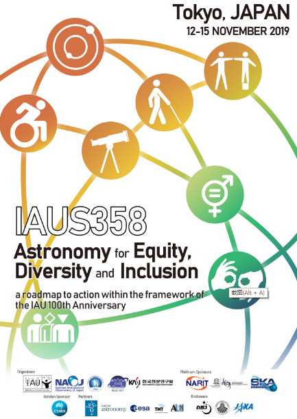 国际天文学联合会研讨会“Astronomy for Equity, Diversity and Inclusion”(IAUS358)于2019年11月12日-15日在日本东京召开。会议以天文学与平等、多样性和包容为主题,在IAU一百周年的框架下讨论可行路线。这是IAU首次举办关于此类主题的研讨会,将为今后IAU关于天文学的公平、平等、多样性和包容性政策的相关决议制定奠定基础。会议由IAU教育、科普和遗产部(Division C)组织。