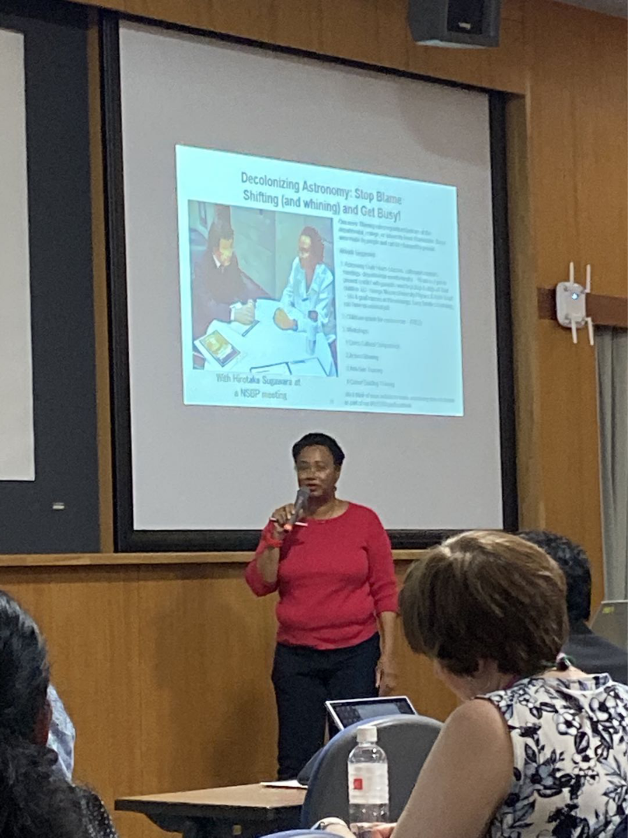南非西开普大学的Jarita Holbrook作为主题演讲的发言人,介绍了如何利用文化天文学来创造更具包容性的天文学(Using Cultural Astronomy to Create a More Inclusive Astronomy)(注:文化天文学大致定义为研究人类及其与天空的关系)。她的报告充满激情,并充分展示了她在推进天文学研究环境中种族、性别平等方面所做的努力。“不要害怕做一个坏人!”她给在场的参会者打气,“因为告诉别人要怎么做,总会得罪人。但是很多时候做一个好人并不解决问题。”
