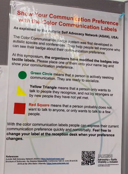 会议的各种细节都处处体现着会议主题:会议注册时,可以标记自己的性别代词、沟通意愿以及是否愿意被拍照。每个参会者的胸牌正反面都印有盲文,楼道的地图上也印有盲文。会议为失明、失聪等人员设置了辅助人员,在会场还可以看到正在工作的导盲犬。