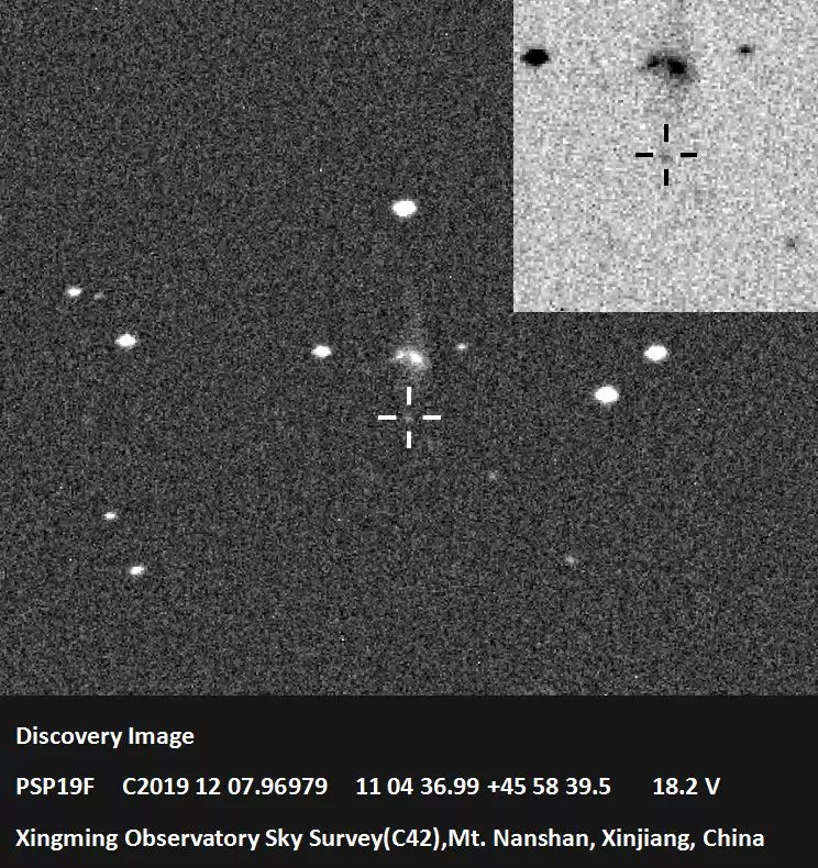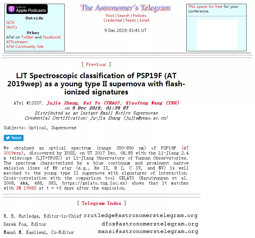 我们获取了PSP19F(AT 2019wep)的光学光谱(波长范围350-890纳米),这一候选体由星明天文台巡天(XOSS)发现,光谱于世界时2019年12月8.85日(译注:原文误为“2017年12月8.85日”)使用云南天文台丽江观测站丽江2.4米望远镜[丽江望远镜(LJT)+云南天文台暗天体相机及分光仪(YFOSC)]获得。蓝色连续谱与沃尔夫-拉叶星的突出狭窄发射线(例如He II,H I,C IV和N V)的光谱特征与有着相互作用特征的早期II型超新星一致。使用比对工具GELATO(Harutyunyan et al. 2008, A&A, 488, 383, https://gelato.tng.iac.es)互相关表明,它与SN 1998S爆炸3天后的光谱匹配。