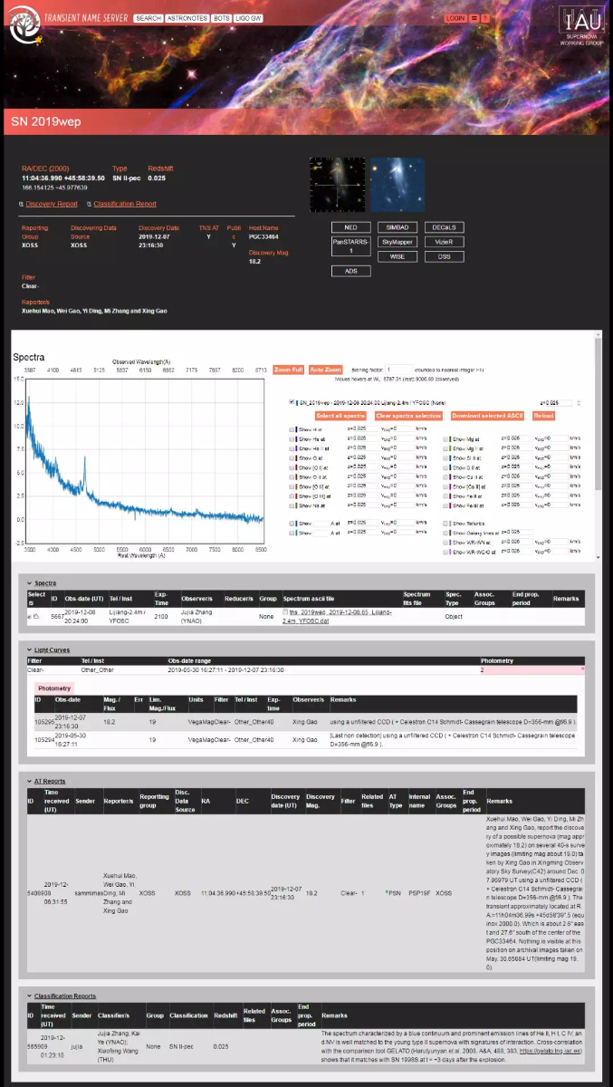 结合PSP图像及BGO补拍图像,经管理员们再次讨论,一致认为可以上报。当即,管理员张宓将超新星候选体上报至国际天文学联合会天文电报中央局瞬变天体证认页(CBAT TOCP)和瞬变源命名服务网站(TNS),该候选体获得候选体编号PSN J11043699+4558395、AT 2019wep,内部编号PSP19F。