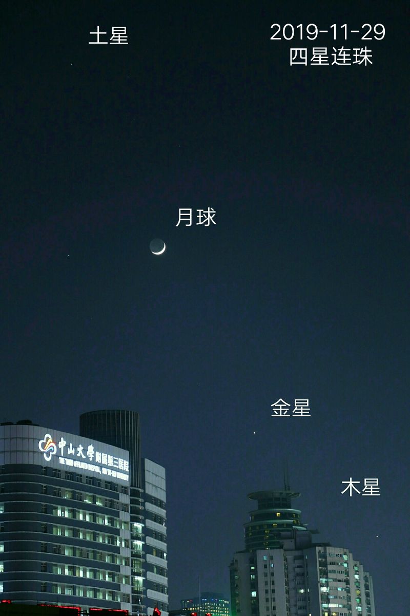 编者按:11月29日,土星、月亮、金星、木星齐聚天宇,在西南方低空排成一条直线,上演了“四星连珠”的天文奇观。华南师范大学附属中学的吕鸿斌老师带领学生们进行了观测。随后,他不仅记录下了所见所想,还使用万维望远镜中的真实天文数据演示了这一天象的科学原理。下面就一起去看看吧!