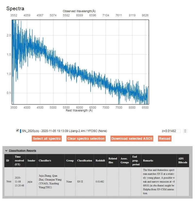 随后,中科院云南天文台张居甲、翟倩、王传军和清华大学王晓锋几位老师,使用丽江观测站2.4米望远镜,获取了该候选体的光谱,随后于11月8日晚将其光谱及分类上报到了TNS,证认该候选体是一颗II型超新星,红移为z=0.01482。该候选体获得超新星正式编号SN 2020yzq。
