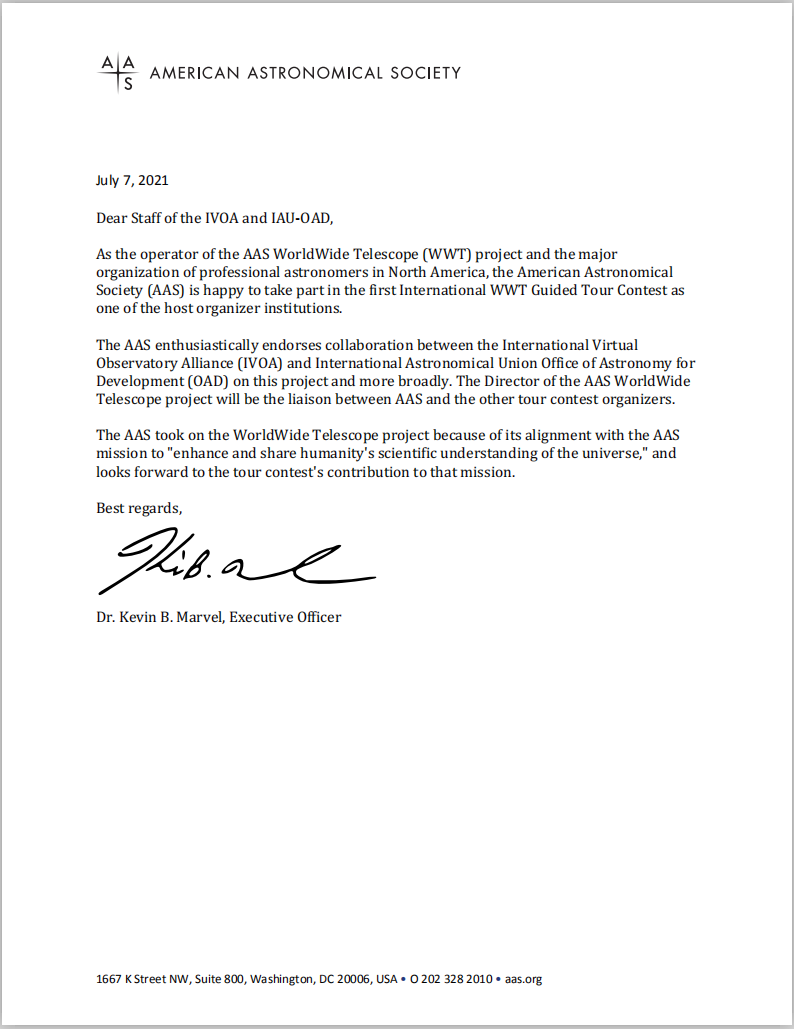 今日,美国天文学会正式致函IVOA和IAU天文与发展办公室,愿意共同主办首届国际万维望远镜宇宙漫游创作大赛,通过大赛助力“增进并分享人类对宇宙的科学认识”的使命。