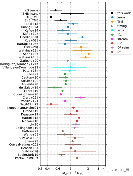 图1 图为国际上各个工作组测量出的银河系质量(以往天文学家测量结果的平均值大约为1万亿倍太阳质量)。