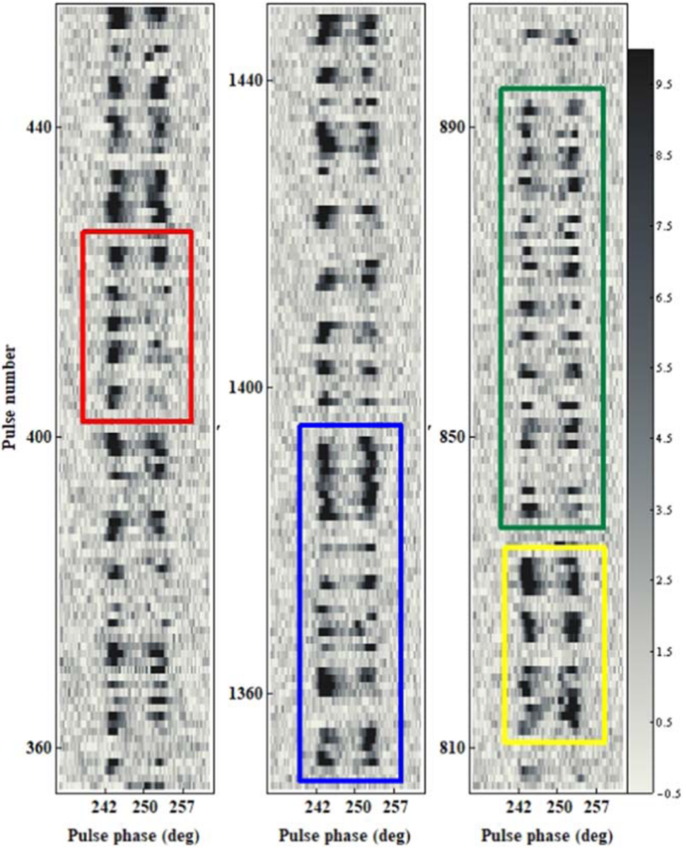 图1 PSR J1900+4221的三段单脉冲序列表现出多种辐射变化现象