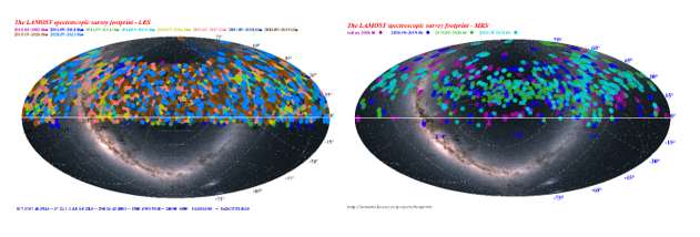 图1 左图为LAMOST先导巡天和低分辨率巡天前九年天区覆盖图,右图为LAMOST前三年中分辨率光谱巡天天区覆盖图。(绘制:袁海龙)