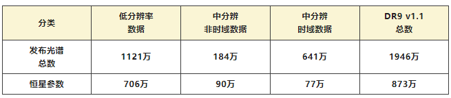 DR9 v1.1 数据集共包括5533个低分辨率观测天区,1529个中分辨率观测天区。发布光谱总数为1946万:其中低分辨率光谱1121万,中分辨率非时域光谱184万,中分辨率时域光谱641万。同时包括一个约873万组的恒星光谱参数星表,具体信息如下: