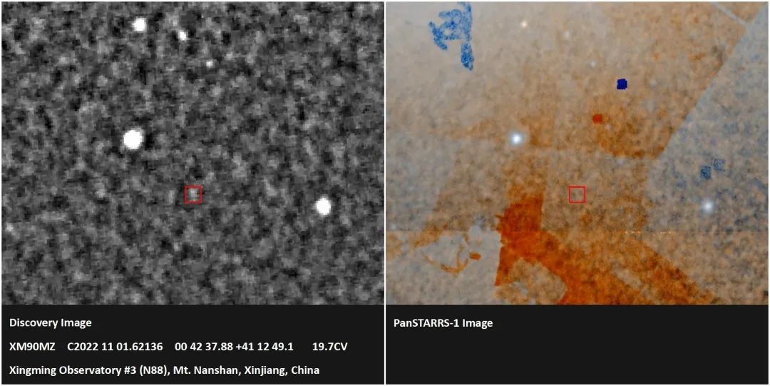 图1 NEXT发现图像(左)中心方框处可见星点,泛星1号望远镜历史图像(右)对应位置没有星点,因此这是新出现的候选体。