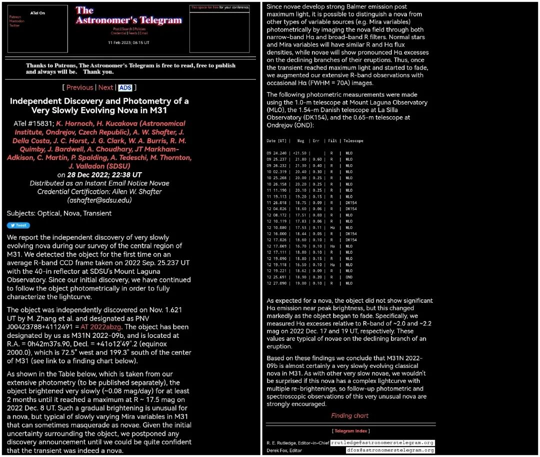 12月29日清晨,来自捷克科学院天文研究所昂德列约夫天文台的天文学家Kamil Hornoch等人发布了第15831号天文学家电报(ATel#15831),报告了他们的独立发现,并将其编号为M31N 2022-09b。他们在9月25日已观测到该候选体,R波段亮度只有21.8±0.6星等,但由于它增亮非常缓慢,直到12月8日在R波段达到17.5星等的最大亮度,这一特征与刍藳型变星相符,因此和我们一样,一直没有报告该候选体。当该候选体在R波段达到最亮后,研究团队在Hα波段对其进行了观测,结果显示它在Hα下继续增亮,并且相对于R波段更亮,这与刍藁型变星不符,反而更像新星。此外,该团队也表示该候选体可能会多次增亮,鼓励对其进行测光和光谱观测。